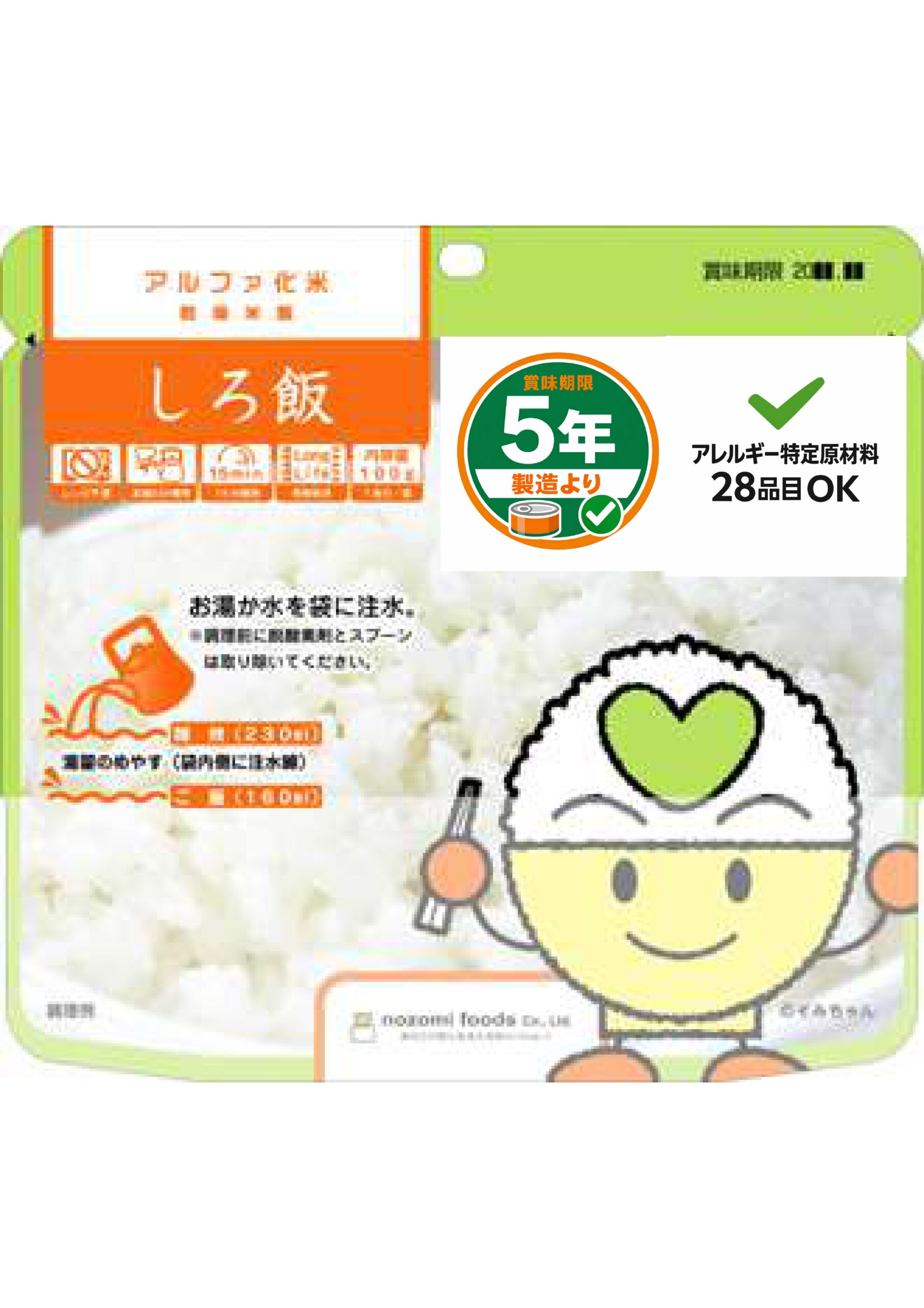 一度炊飯したご飯を温風で乾保した乾燥ご飯で、お湯や水で戻すだけで召し上がることができます。 希望食品のアルファ化米は、炊飯によってお米のアルファ化 を行っています。これは炊くときに味付けを行うためで、お米 自身に味がついているユニークなアルファ化米です。