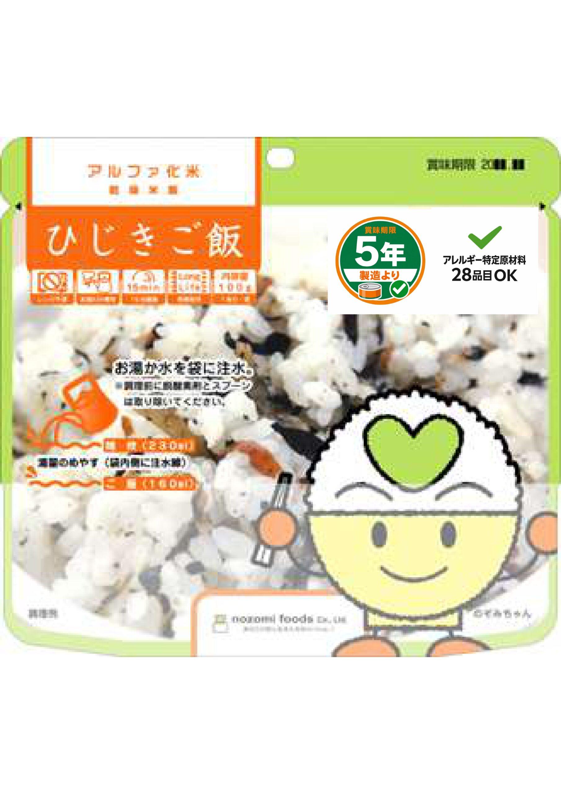 一度炊飯したご飯を温風で乾保した乾燥ご飯で、お湯や水で戻すだけで召し上がることができます。 希望食品のアルファ化米は、炊飯によってお米のアルファ化 を行っています。これは炊くときに味付けを行うためで、お米 自身に味がついているユニークなアルファ化米です。