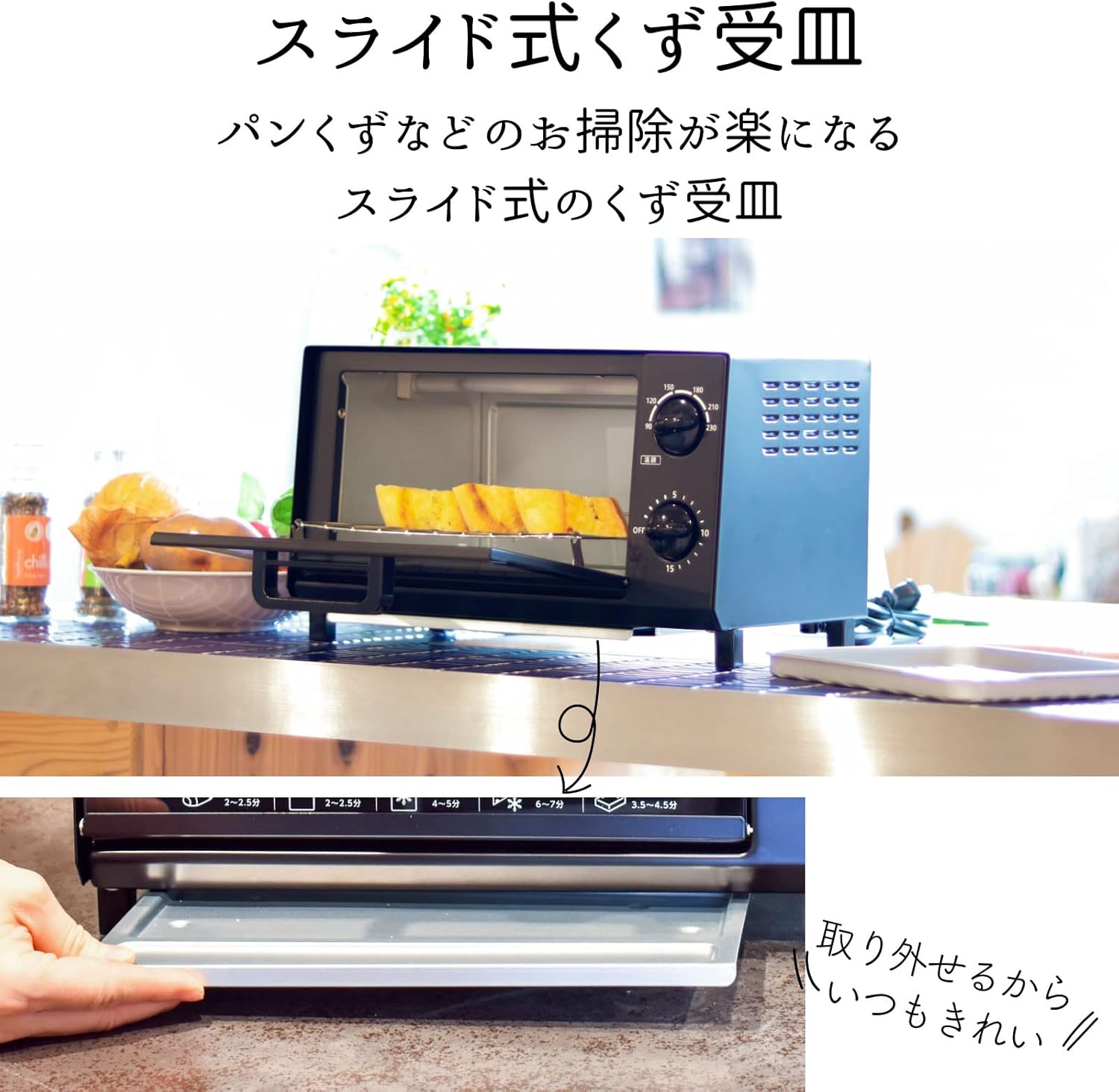 ● パンくずなどのお掃除が楽になるスライド式のくず受皿