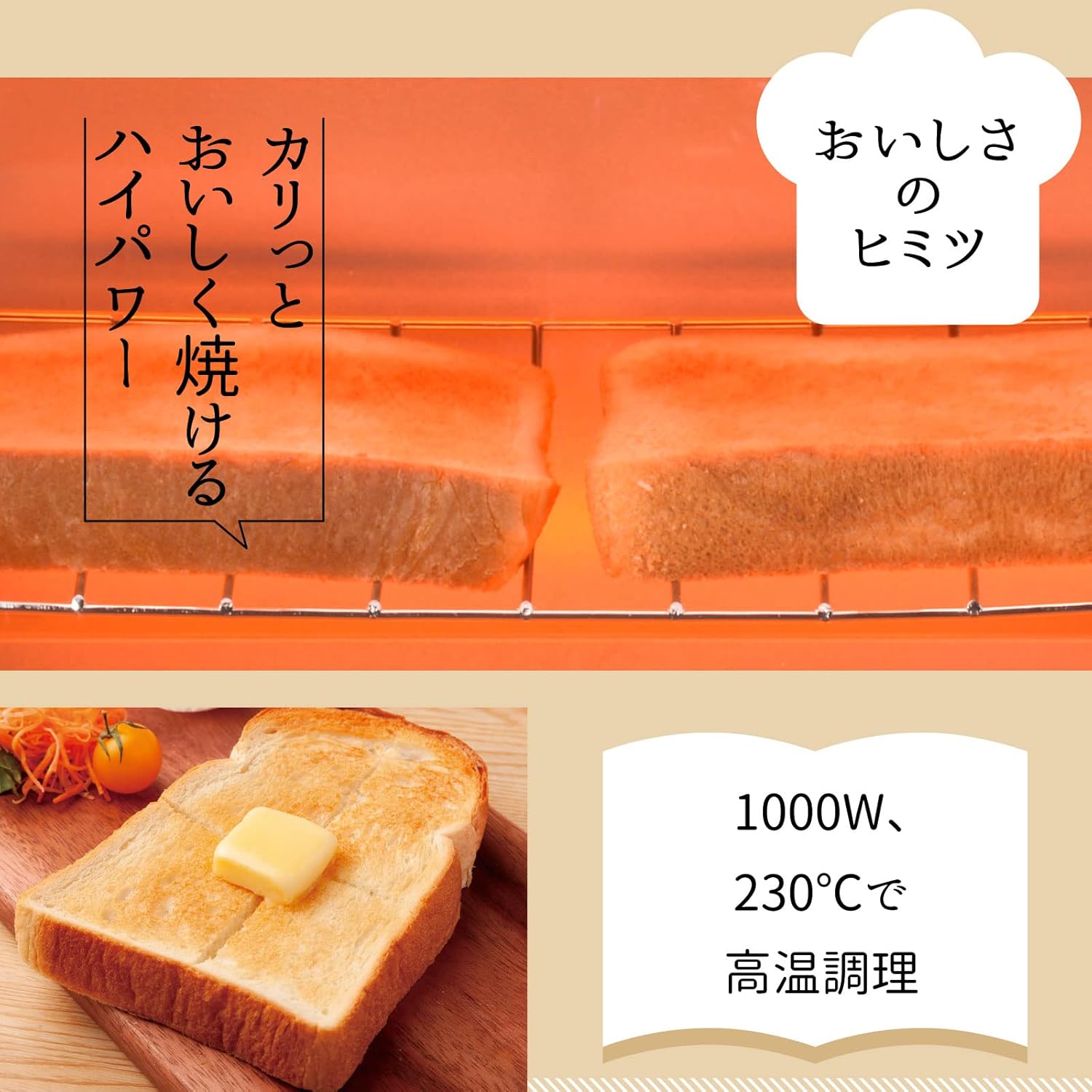 ● カリッとおいしく焼ける1000Wハイパワー