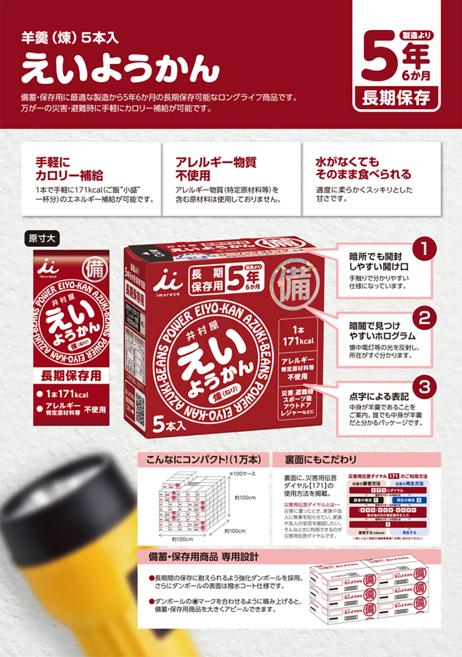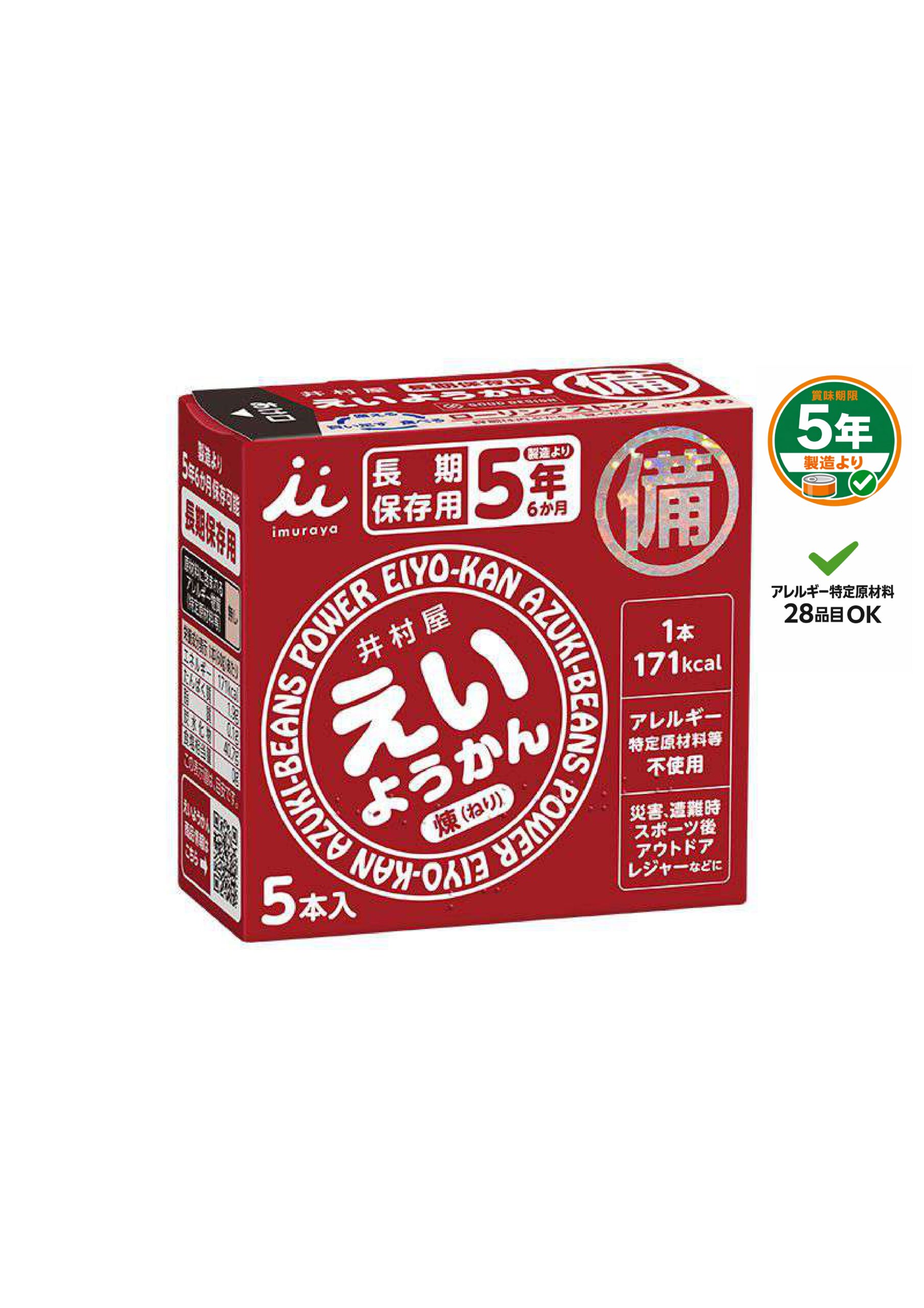 備蓄保存用に最適な賞味期間5年6か月のようかんです。