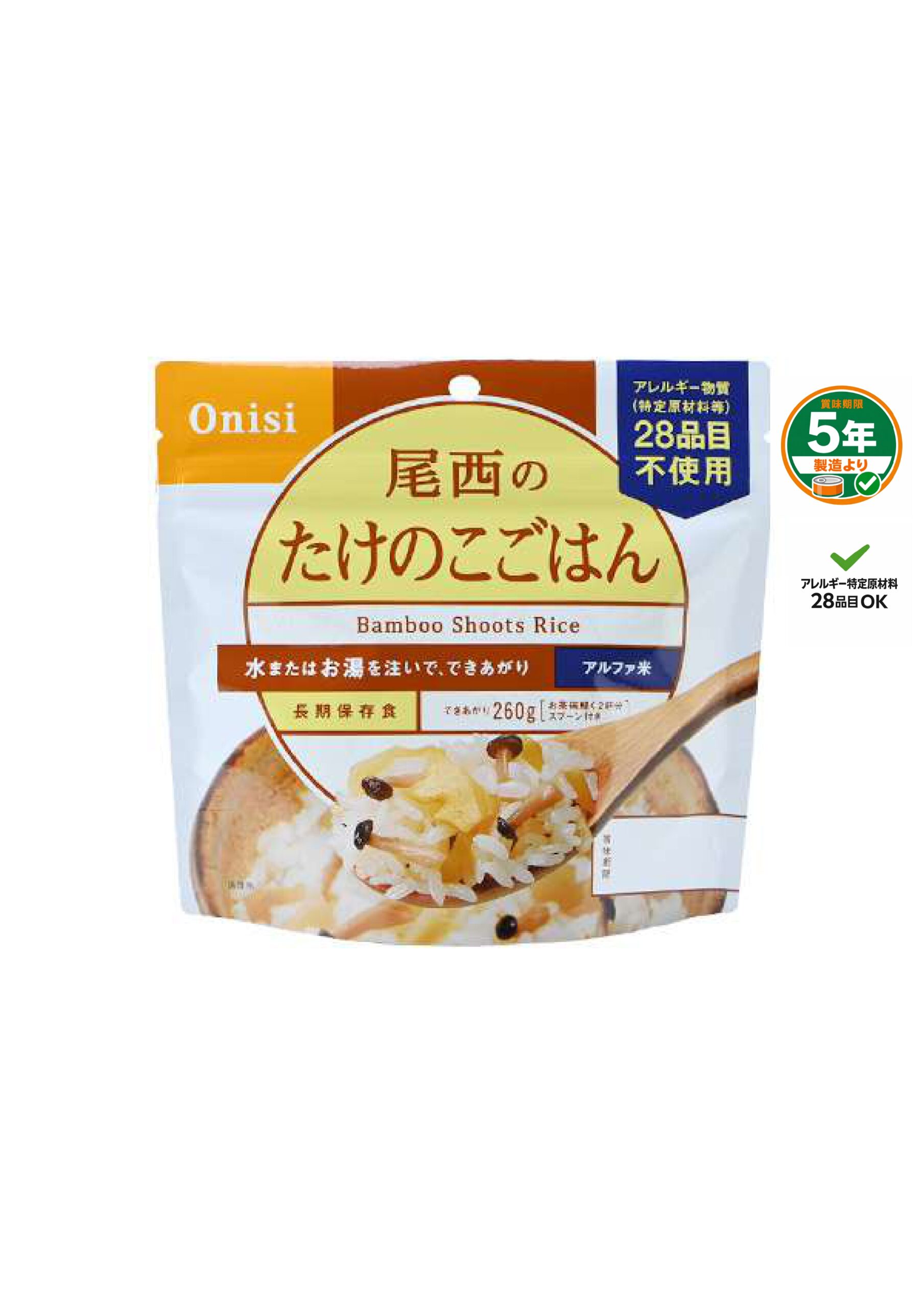 うるち米(国産)、味付乾燥具材(水煮たけのこ、ぶなしめじ、ぶとう糖、でん粉分解物、食塩)、調味粉末(食塩、かつお節エキス粉末、かつお節粉末、ぶどう糖加工品、砂糖、でん粉)/調味料(アミノ酸等)、トレハロース、酸化防止剤(ビタミンE)、香料