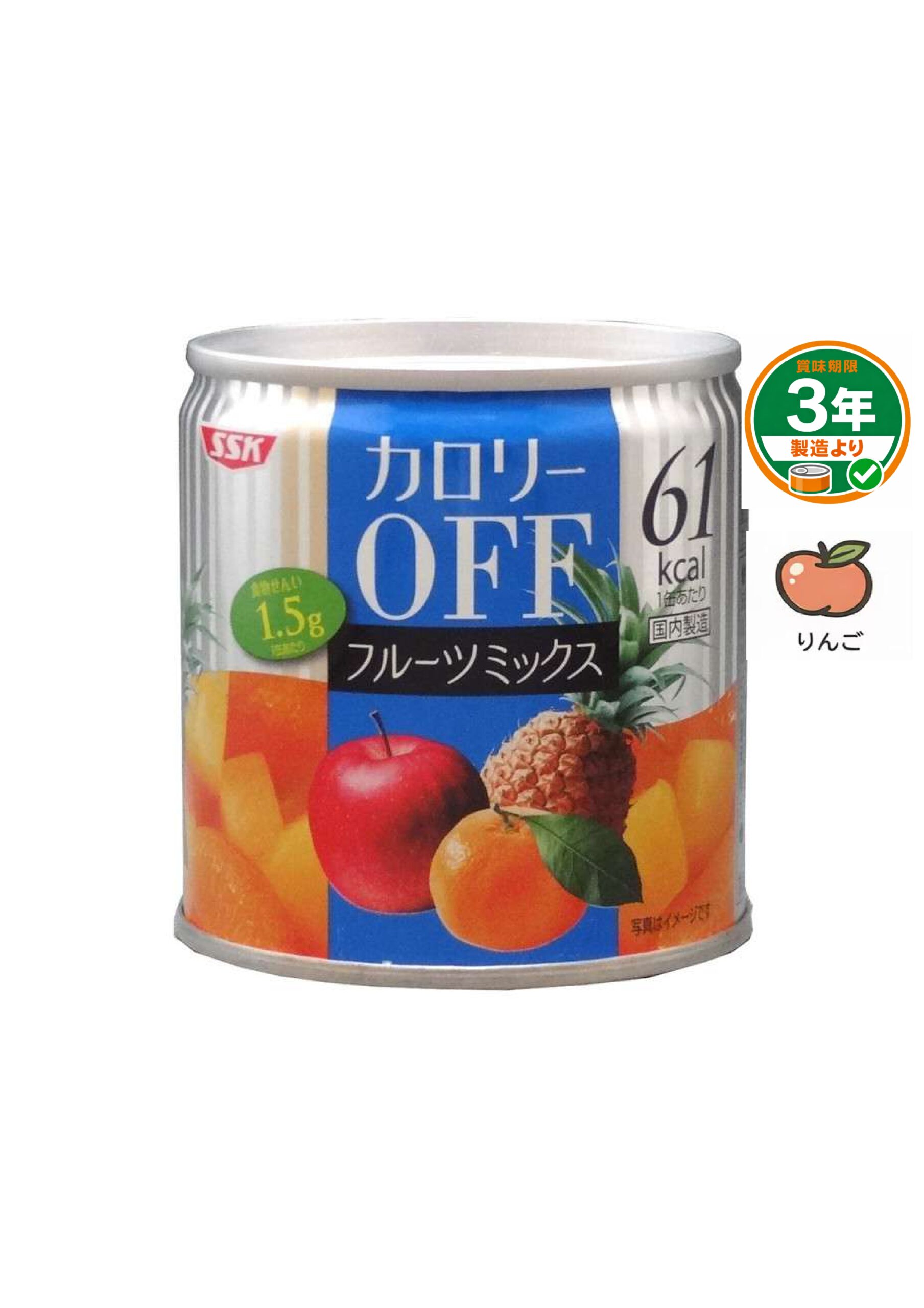 カロリーオフのフルーツ缶詰です。便利な食べ切りサイズ。カロリーオフなのに美味しい、すっきりした甘さに仕上げました。みかん、パイン、りんごの3種類のフルーツミックスです。1缶あたり61kcal。不足しがちな食物繊維は1缶あたり1.5g。ヨーグルトのトッピングとしておすすめです。冷やしてそのままでも美味しく召し上がれます。