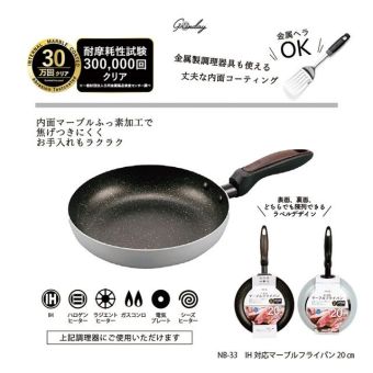 | 材質 | 表面加工/内面:ふっ素樹脂塗膜加工、外面:焼付塗装、本体/アルミ(底の厚さ2.3mm)、はり底/ステンレス鋼(クロム18%)、取手/フェノール樹脂・ABS |