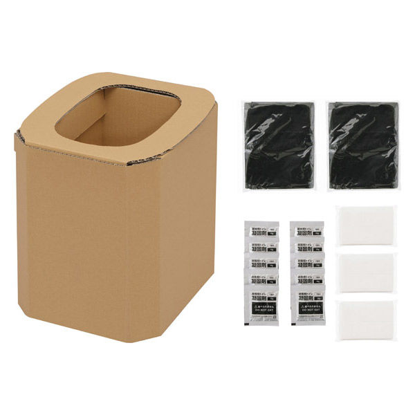 | 設置場所 | 屋内 | 素材 | トイレ本体:段ボール、凝固剤:高分子給水樹脂、抗菌剤、汚物袋:ポリエチレン |