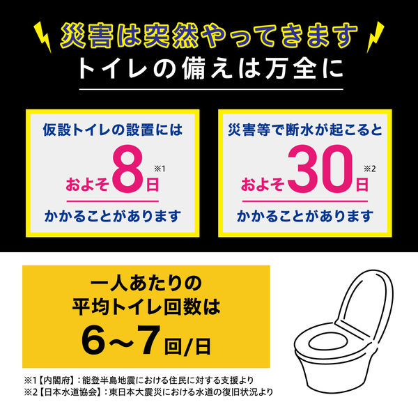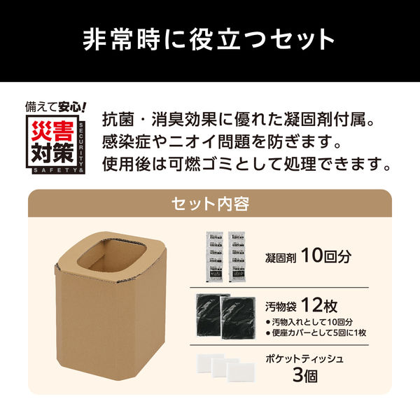 | 商品の特徴 | 非常時に必要なものが揃うので開けてすぐに使用できます。抗菌・消臭効果に優れる凝固剤が10回分付属、感染症やニオイ問題を防ぎます。便座カバーとして使用可能な汚物袋が5回分につき+1枚付いています。ポケットティッシュが付いていて非常時でも衛生的です。繰り返し耐久試験結果で5000回をクリアし耐久性に優れています。 | ||