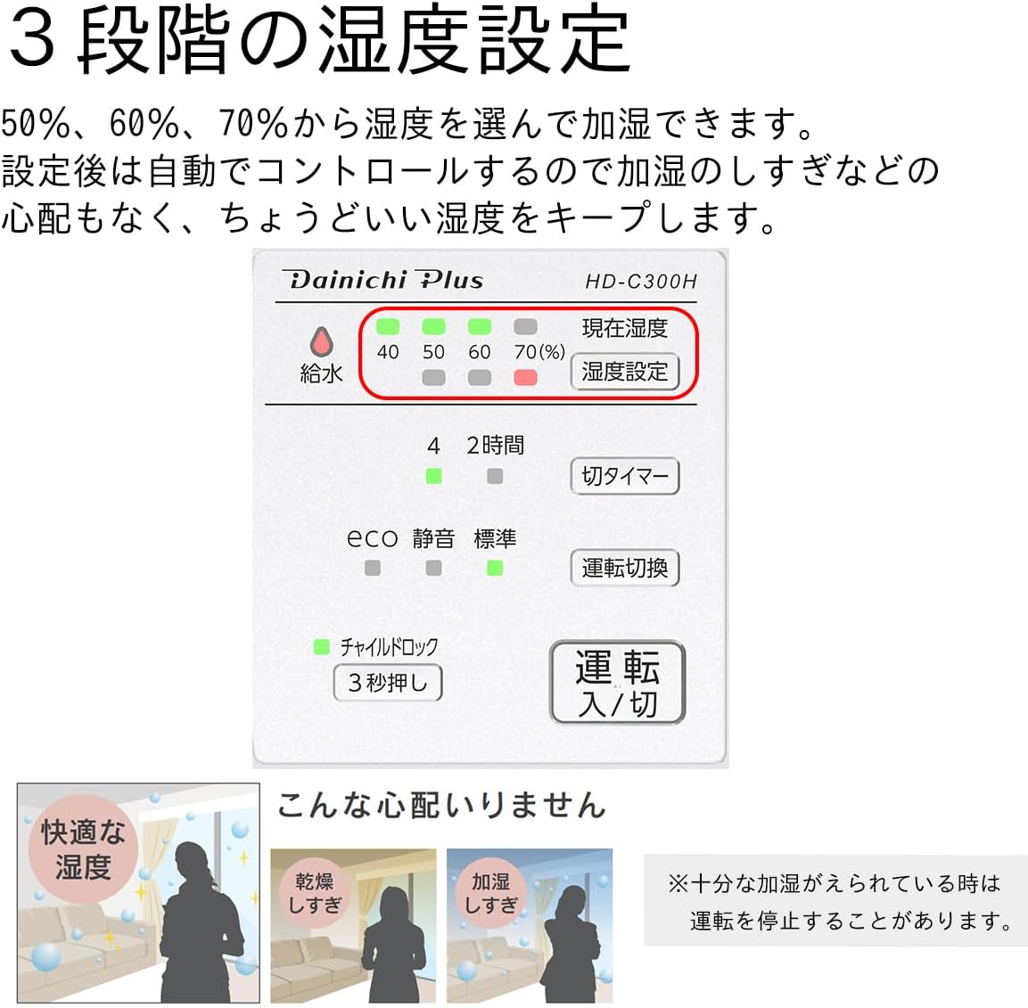 - 適用床面積:〔木造和室〕5.0畳(8m2)、〔プレハブ洋室〕8畳(14m2)●タンク容量:2.5L●最大加湿量:標準=300ml/h 、静音=250ml/h、eco=160ml/h●連続加湿時間:標準=8.3h、静音=10.0h、eco=15.6h ※加湿量(最大)は室温20度、湿度30%の場合。室内の湿度や温度条件により加湿量は変わります。