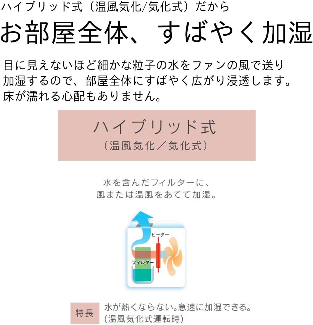 - 【キレイにいうるおう抗菌加工】水と風の通り道に抗菌加工をほどこし、清潔なうるおいをキープ。抗菌気化フィルターは、抗菌・防カビ加工を施し、トレイ内の雑菌・カビの繁殖を抑えます。防カビフィルターは、防カビ加工を施し、お部屋の空気から捕らえたカビの増殖を抑えます。