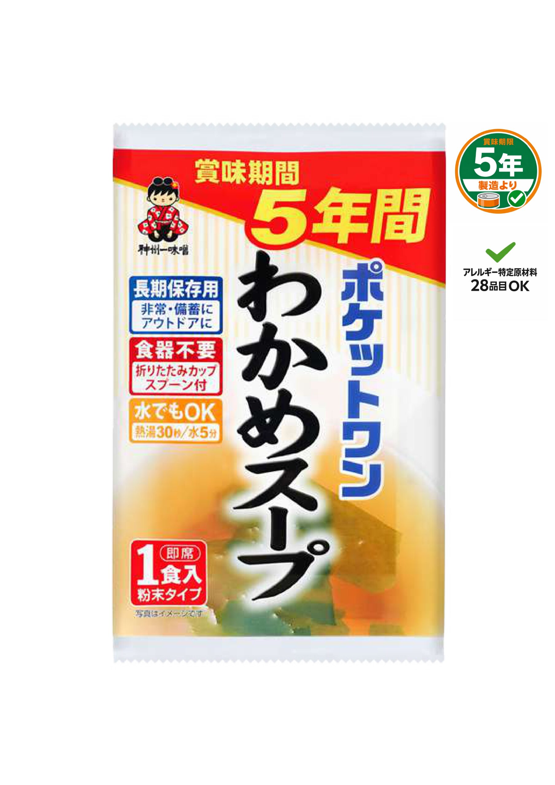 | 原材料 | デキストリン(国内製造)、食塩、ぶどう糖、野菜エキスパウダー、香辛料、具(わかめ)/調味料(アミノ酸)、カラメル色素、微粒二酸化ケイ素、香料 |