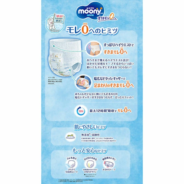 赤ちゃんがどんなに動いても足まわりの幅広いギャザーがすきまをつくらず、ぴったりフィット!