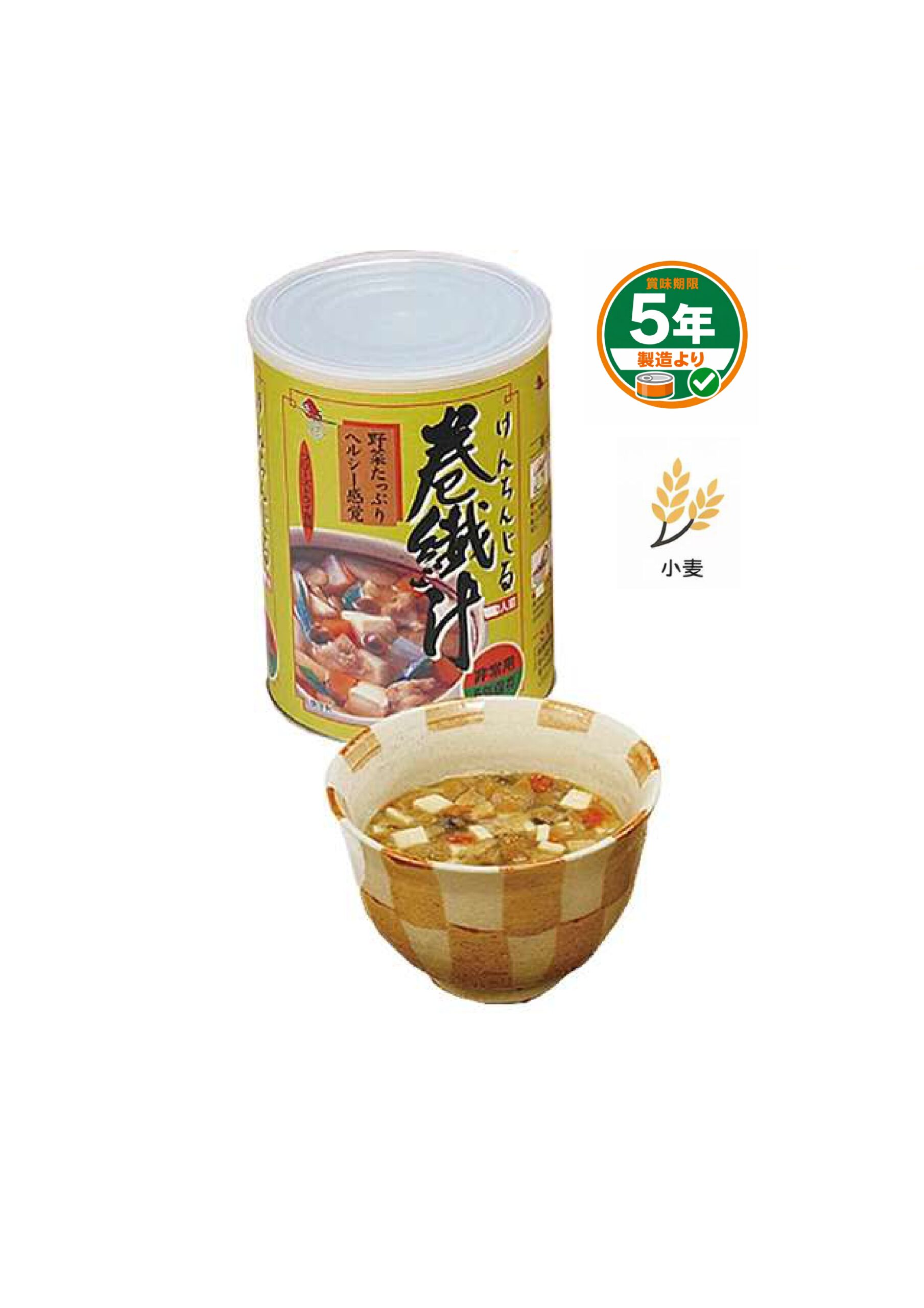 5年保存可能な、フリーズドライ製法で作られたけんちん汁缶です。鍋に1缶と熱湯3L加えて混ぜるだけで本格的な味わいを楽しめます。避難所での温かい食事は炊き出しは被災者にとって大きな安心につながります。けんちん汁は野菜たっぷりで非常時に不足しがちな栄養素を補えます。