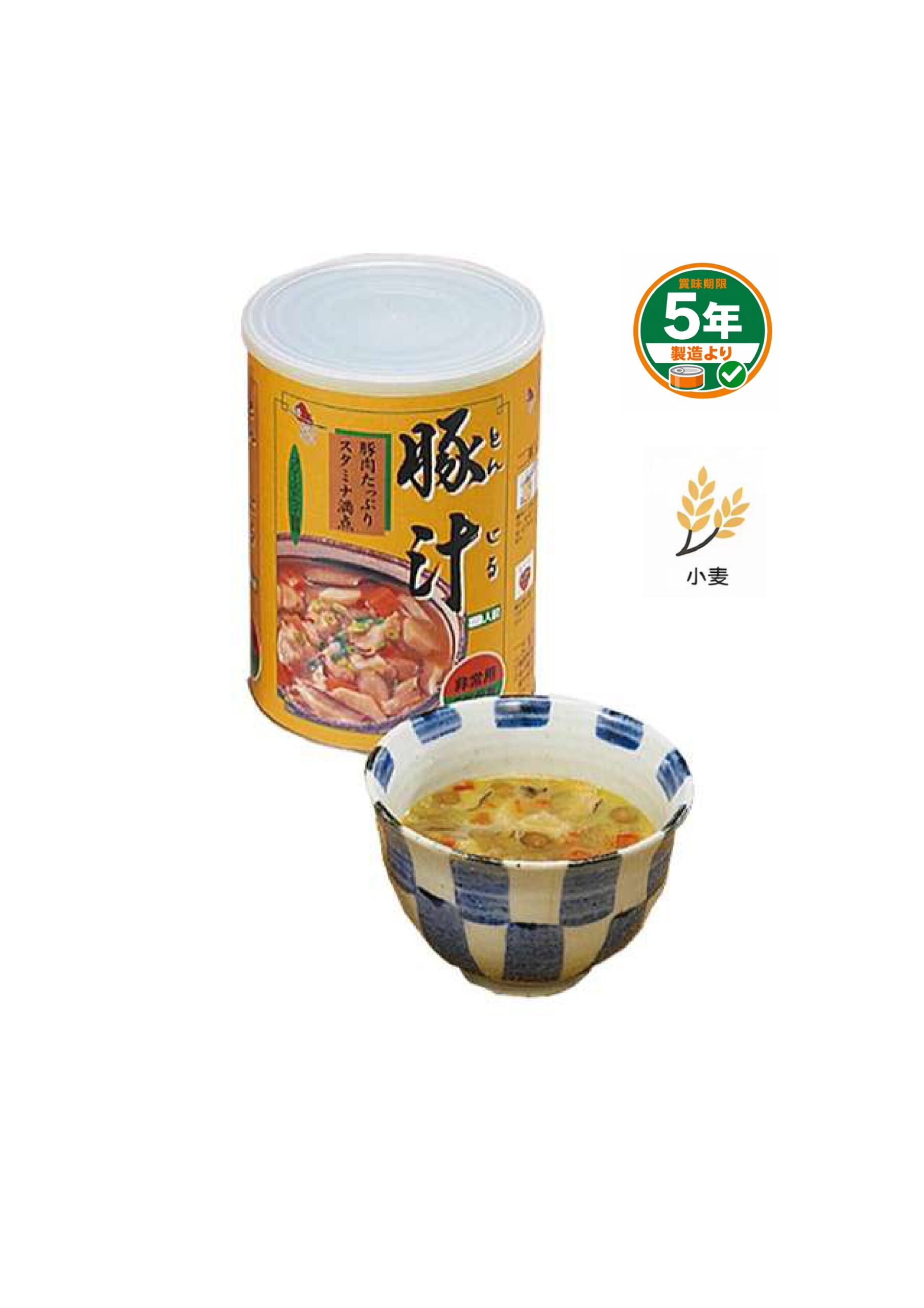 5年保存可能な、フリーズドライ製法で作られた豚汁缶です。鍋に1缶と熱湯3L加えて混ぜるだけで本格的な味わいを楽しめます。避難所での温かい食事は炊き出しは被災者にとって大きな安心につながります。豚汁は豚肉たっぷりで非常時に不足しがちなたんぱく質を手軽に補えます。