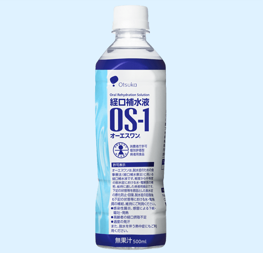 オーエスワンは、脱水症のための食事療法(経口補水療法)に用いる経口補水液です。軽度から中等度の脱水症における水・電解質の補給、維持に適した病者用食品です。下記の状態等を原因とした脱水症の悪化防止・回復、脱水症の回復後も下記の状態等における水・電解質の補給、維持にご利用ください。