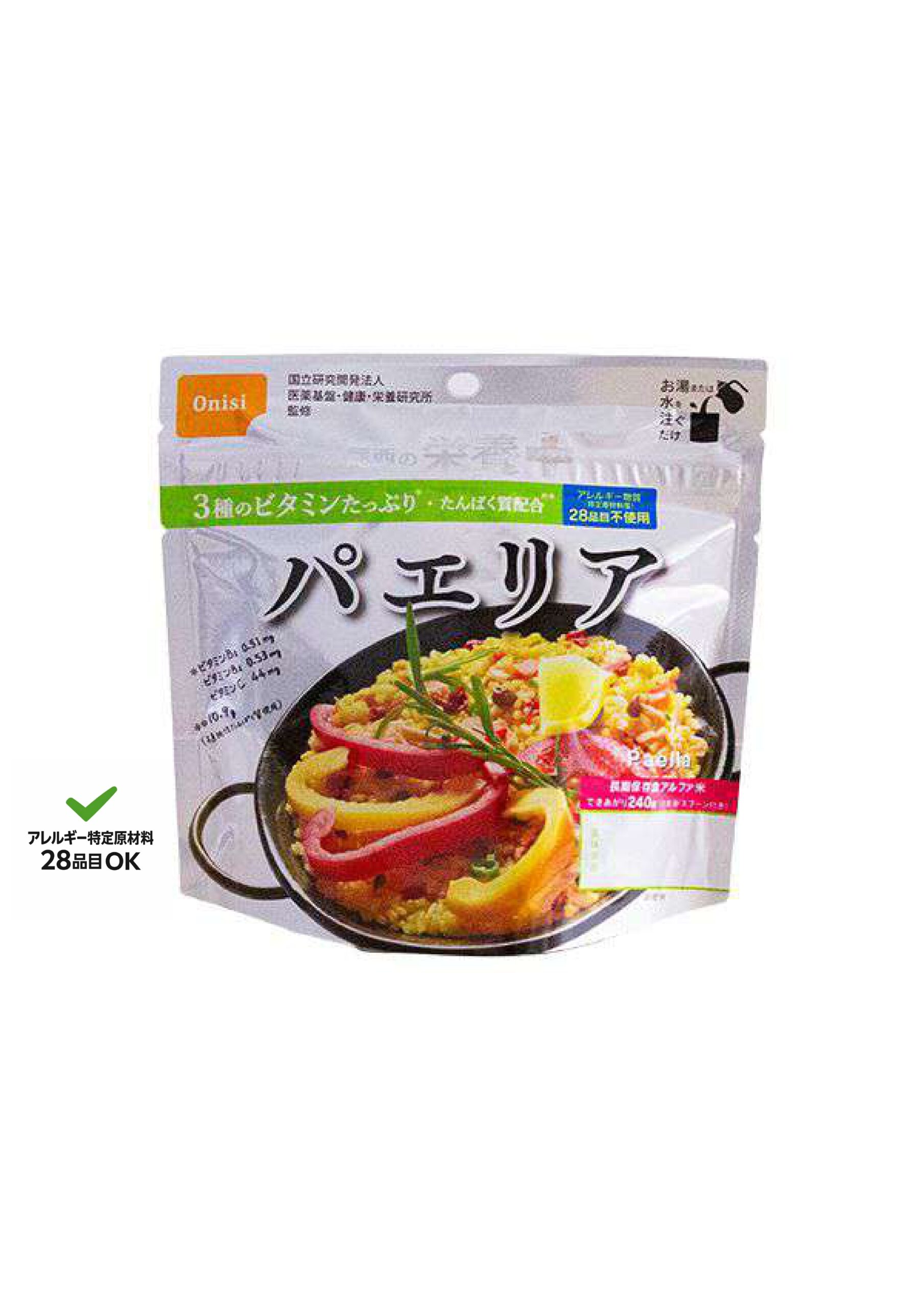 栄養+とは・・・?災害時に不足しがちな栄養を手軽に補給できる 3種のビタミンたっぷり*、たんぱく質配合(植物性たんぱく質10.9g) 彩り野菜を使ったターメリック香るパエリア(具材に魚介・肉類は入っておりません) 国産米使用、アレルギー物質28品目不使用、ハラール認証取得、 国立研究開発法人 医薬基盤・健康・栄養研究所 監修 *ビタミンB1:0.51㎎ ビタミンB2:0.53㎎ ビタミンC:44㎎ 災害時に重要な3種のビタミン(※)の1食分に占める割合 ビタミンB1:138% ビタミンB2:133% ビタミンC:132% ※『避難所における食事提供の計画・評価のために当面目標とする栄養の参照量(厚生労働省2011)』をもとに算出