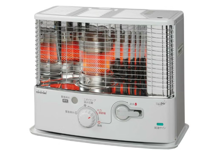 乾電池のいらない手回し点火式ストーブ。広く暖めるワイドタイプ。