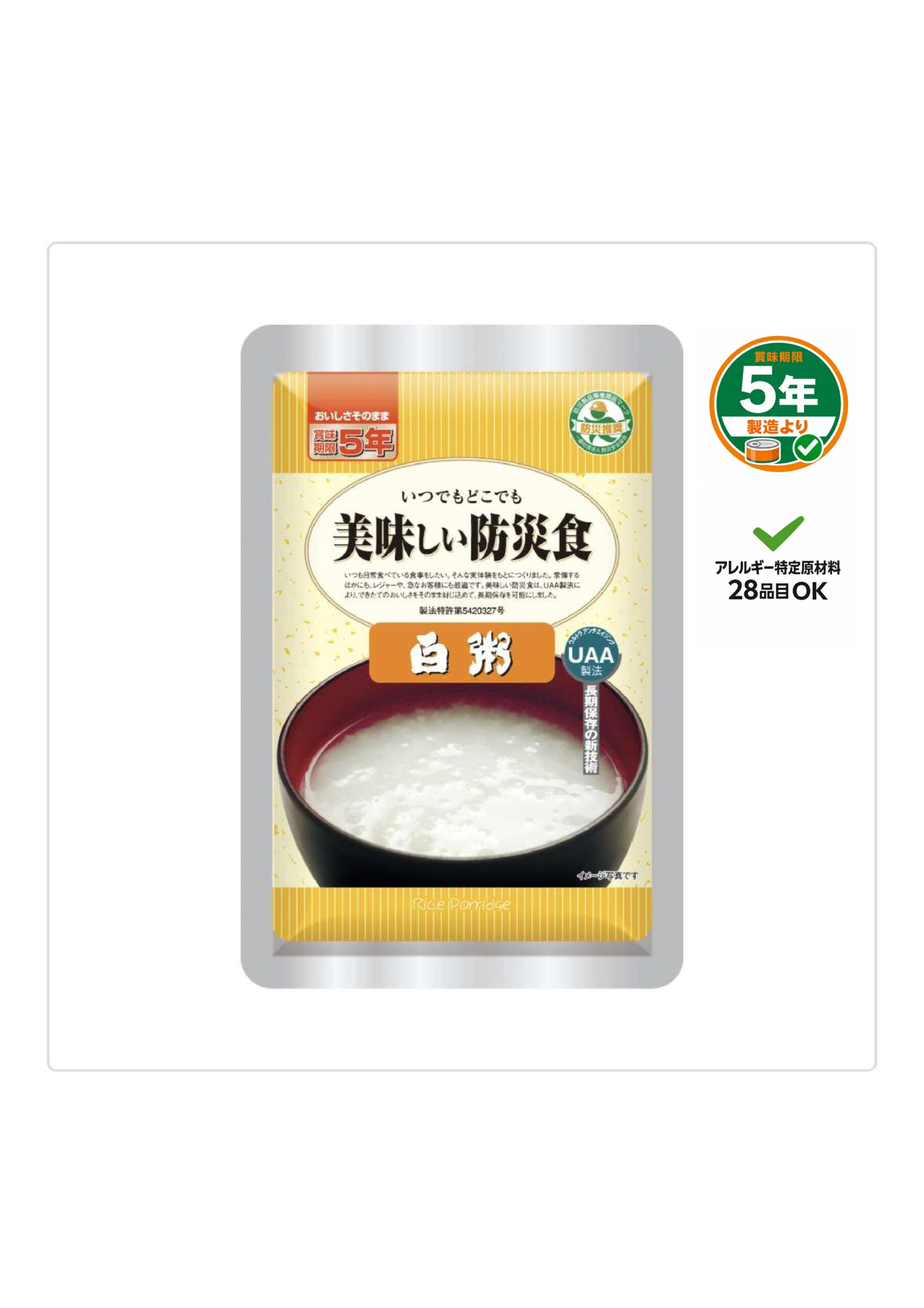 おなかに優しいシンプルな味付けのお粥が”常温で5年7ヶ月保存可能”な防災食に。