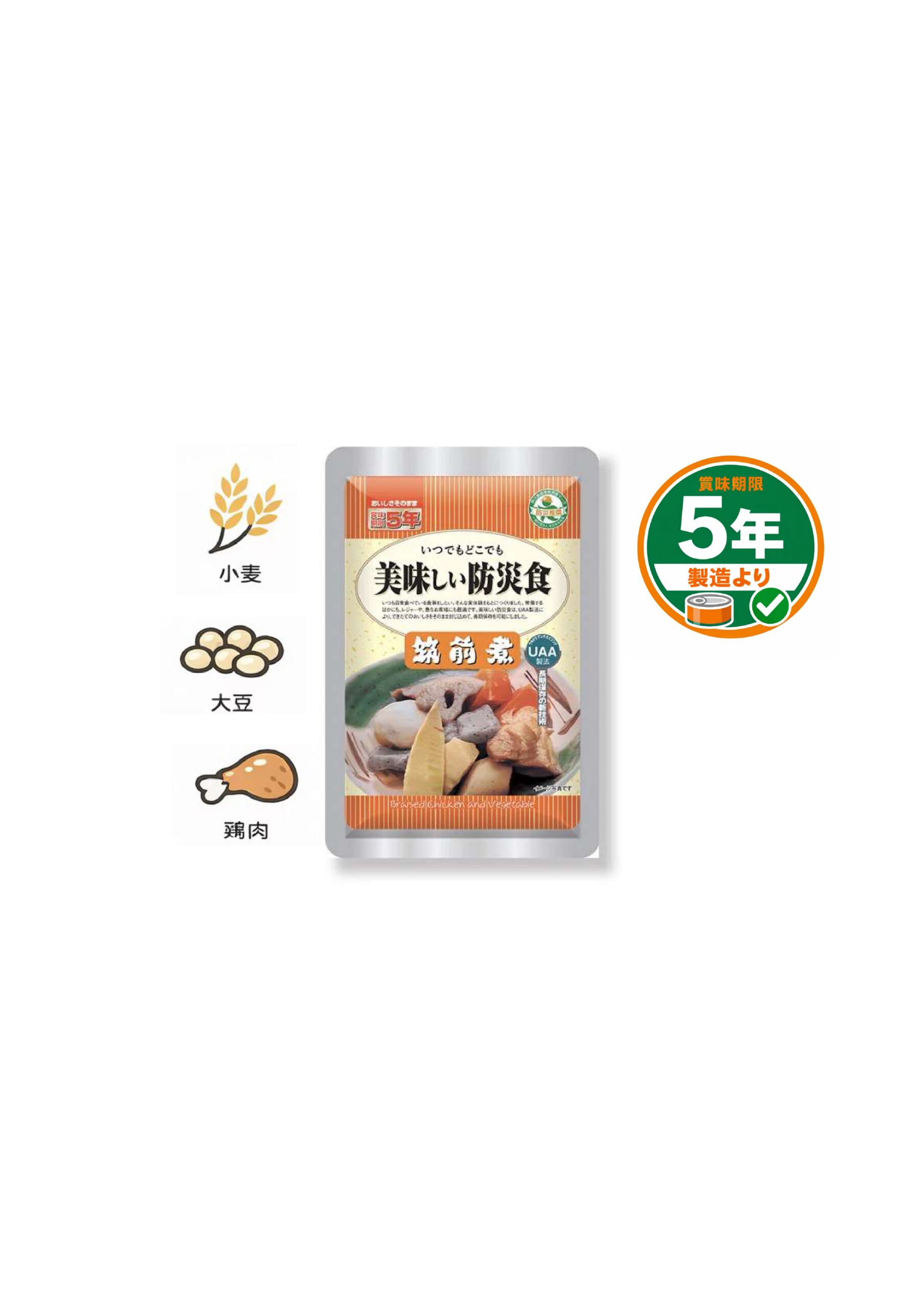 野菜に鶏肉の旨みがしみ込んだ、美味しい筑前煮が常温で5年7ヶ月保存可能な防災食です。