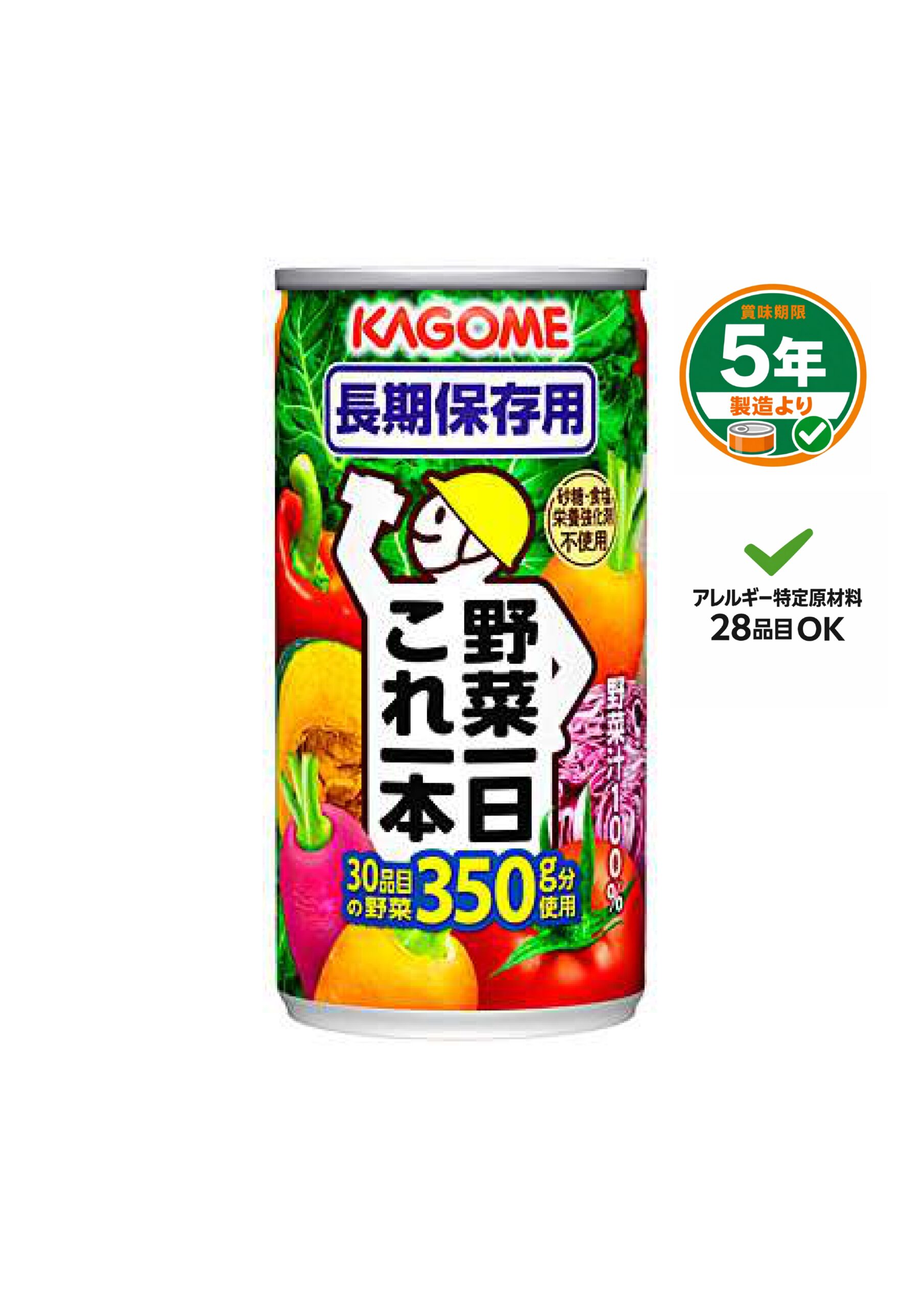 「野菜一日これ一本長期保存用」は、賞味期間5.5年で長期保存が可能な「野菜の保存食」です。1缶に野菜1日分350g分をぎゅっと濃縮して使用。緑黄色野菜を中心に、30品目の野菜を使用しています。砂糖・食塩・栄養強化剤不使用。「野菜一日これ一本長期保存用」を備蓄食品の1つに加え、普段から非常時に備えておきましょう。(野菜飲料は、原料野菜の全成分を含むものではありません)