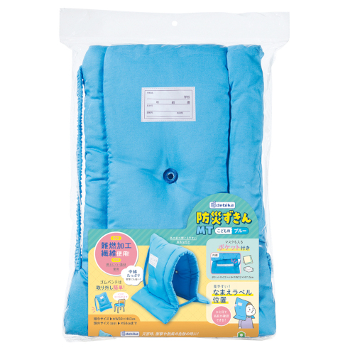 生地・中綿は燃えにくい素材を使用/中綿たっぷり、衝撃にも強い/ゴムバンドは取り外し簡単/便利ななまえラベル付き。