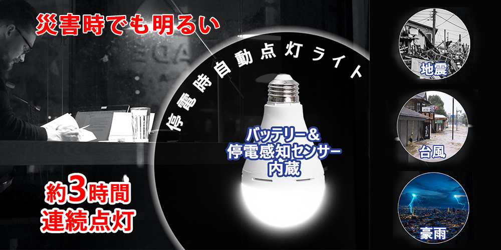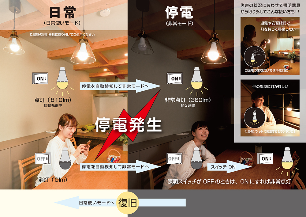 非常時の明かりの確保に。防災電球は、省エネLED電球としてご自宅の照明器具に取り付けて普段使い使いするだけで、停電に備える事が出来ます。停電を自動感知し非常点灯モードに切り替わり、停電の時も照明器具のスイッチ操作で点灯することが出来ます。またソケットから取り外して、懐中電灯やランタンとしても使用できます。蓄電池を内蔵しており、通常使用時(点灯時)に勝手に充電してくれますので、面倒な電池の入れ替えや充電の必要もありません。お部屋や洗面所、トイレなどの電球を防災電球に変えておけば、真っ暗な中明かりを探さなくても大丈夫。日常使いの点灯時に充電され、停電時は7時間の点灯が可能となります。