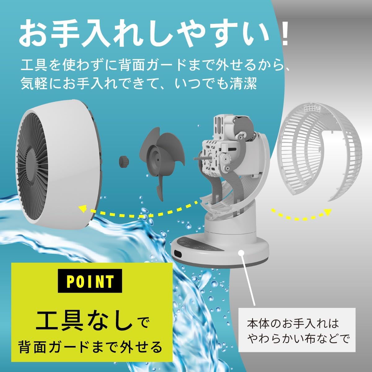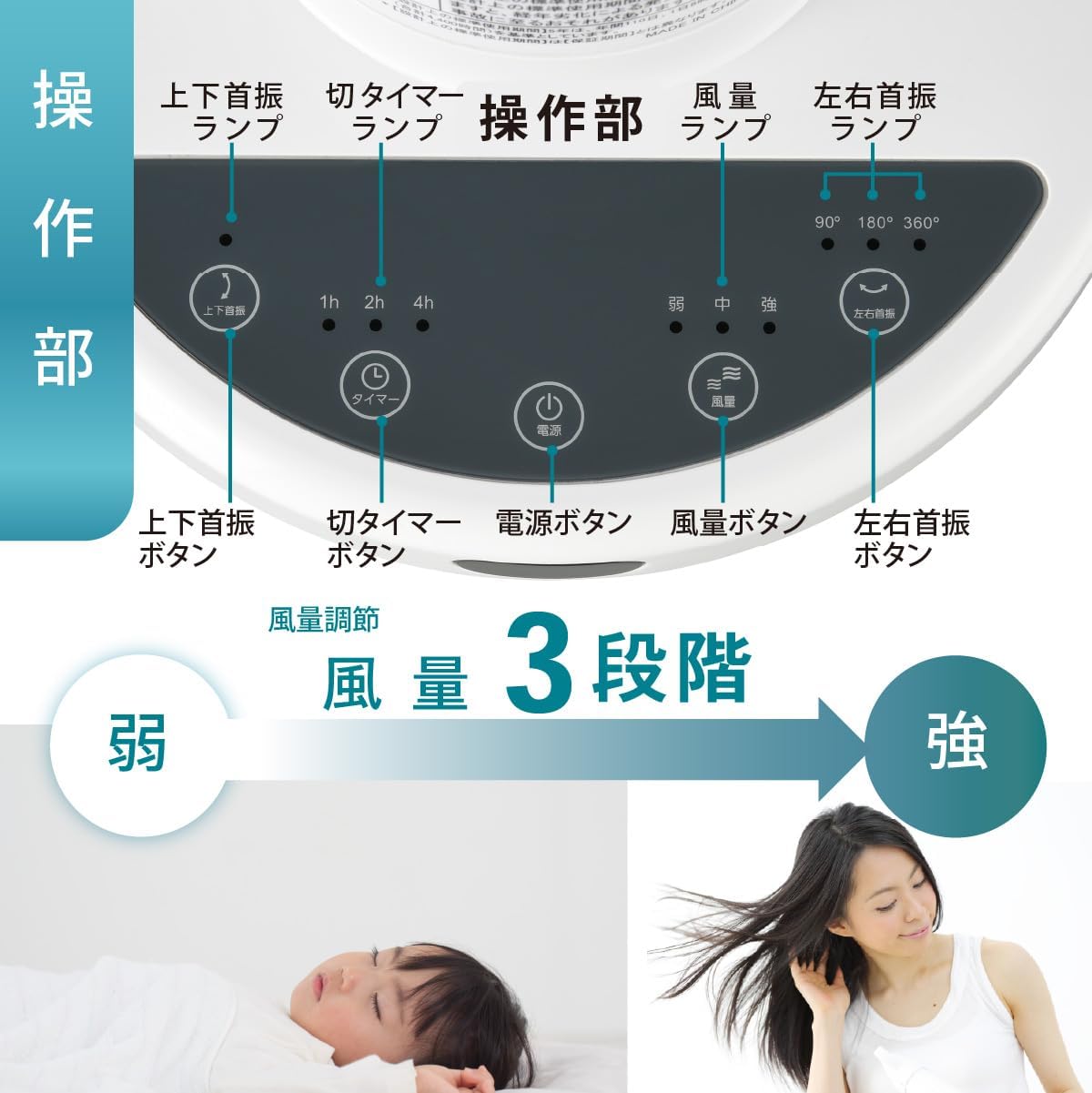 工具なしで背面ガードまで外せてお手入れしやすい/風量調節3段階(弱/中/強)/切タイマー3段階(1h/2h/4h)/左右3段階(90°/180°/360°)、上下約90°自動首振り/適用畳数18畳まで ※風量強(最大)時での当社基準(目安)/リモコン付き