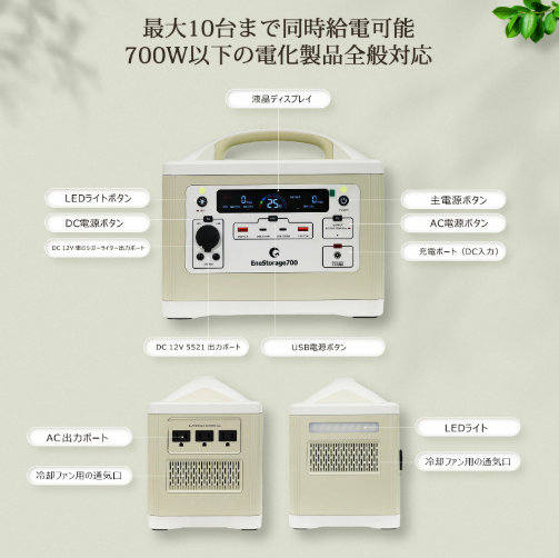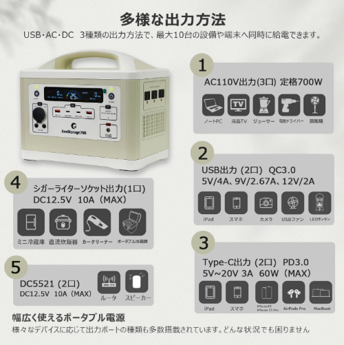 | AC出力 | AC110V 50Hz/60Hz切替可(2芯・3芯兼用)×2ポート 700W(瞬間最大1400W) 純正弦波出力 |